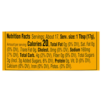 Heinz 57 Collection Infused Honey with Hot Chili, 11.25 oz Bottle ... Heinz Heinz 57 Collection Infused Honey with Hot Chili, 11.25 oz Bottle $6.78 60.3 ¢/oz Add to cart Shipping, arrives by tomorrow to Sacramento, 95829 Want it faster? Add an address to see options Pickup not available at Sacramento Supercenter Check availability nearby Sold and shipped by Walmart.com Free 90-Day returns This item is gift eligible Nutrition Label - Allergen Inside MARINATE, GRILL & DIP SAUCE Add zest to chicken, steak and pork with Heinz 57 Sauce., UPC Code 013000052474 Manufactured by Kraft Heinz Foods Company. Allergen Inside Helping You Shop & Eat Safer. Home; ... Nutrition Label. Nutrition Facts. Serving Size 1.00 tbsp. Amount Per Serving. Calories 20 Calories from Fat 0 % Daily Value* Total Fat 0g ...