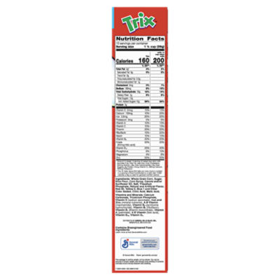 Trix nutrition label. Nutrition Label - Allergen Inside Trix Trolls with Marshmallows Breakfast Cereal - 16oz - General Mills Contains: Does not contain any of the 8 major allergens, State of Readiness: Ready to eat, Store: Room temperature, Package Quantity: 1, Package type: Individual item multi-serving, Net weight: 16 ounces, UPC Code 016000155350 Manufactured by General Mills, Inc. Trix - Brands - Food we make - General Mills The cereal for kids, adults and tricky rabbits Start the day with fun and with the fruity flavors of Trix. Six flavors of crispy puffs — raspberry red, lemony lemon, orangey orange, wildberry blue, grapity purple, and watermelon — are fortified with 12 vitamins and minerals, and 28 grams of whole grain per serving. History Yoplait® Trix™ Gluten Free Yogurt Single Serve Cup Strawberry Banana ... Low fat, kid-friendly Yoplait® Trix™ gluten-free yogurt made with creamy, low fat strawberry banana flavor in a 4 oz single serve cup. Made without gelatin. ... Nutrition Facts. Nutrition Facts. Ingredients & Allergens. Ingredients & Allergens. Preparation Instructions. Preparation Instructions Frequently Purchased Together ... Calories in Trix Cereal and Nutrition Facts - fatsecret.com 2g. Carbs. 33g. Protein. 2g. There are 160 calories in 1 1/4 cups (39 g) of Trix Cereal. Calorie breakdown: 11% fat, 84% carbs, 5% protein.