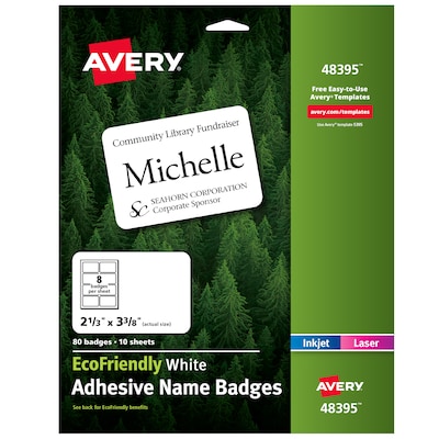 Amazon.com : Avery 8395 Laser/Inkjet Name Badges,2-1/3-Inch X3-3/8-Inch ... Amazon.com : Avery 8395 Laser/Inkjet Name Badges,2-1/3-Inch X3-3/8-Inch,160/Pk,Plain We : Office Products ... Write directly on them, or use free templates from Avery Design & Print to easily add specialized messages, text, graphics and logos on the spot at meetings or seminars. Improved flexibility allows the badges to move with your clothing ...