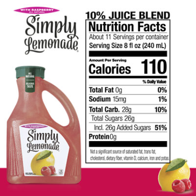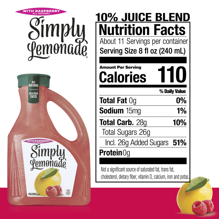 Simply Raspberry Lemonade Nutrition Label - Simply Simply Raspberry ... There are 110 calories in 8 fl oz (240 ml) of simply lemonade raspberry lemonade. Total carbohydrate 27g, 10% ; *75% less sugar and calories than our regular . View calories, net carbs, added sugars, sodium, protein, total carbohydrates, fats, vitamins, minerals,. For simply lemonade with raspberry, .