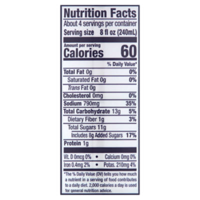 Clamato Nutrition Facts - Eat This Much Calories, carbs, fat, protein, fiber, cholesterol, and more for Clamato (Mott's). Want to use it in a meal plan? Head to the diet generator and enter the ... Calories in Clamato Juice - Nutritionix The % Daily Value (DV) tells you how much a nutrient in a serving of food contributes to a daily diet. 2000 calories a day is used for general nutrition advice.